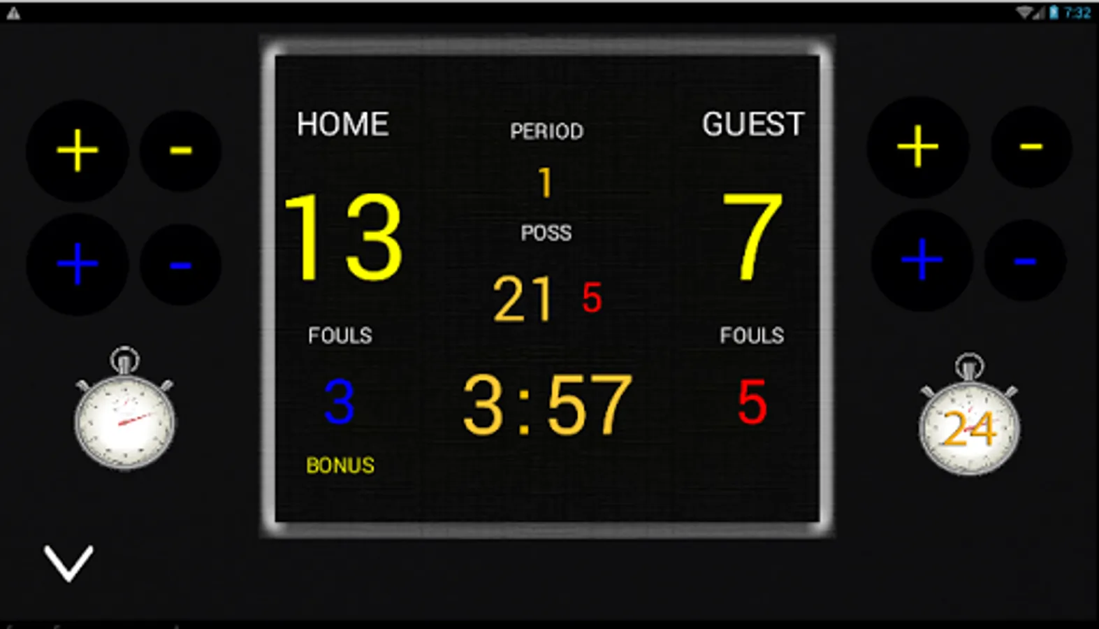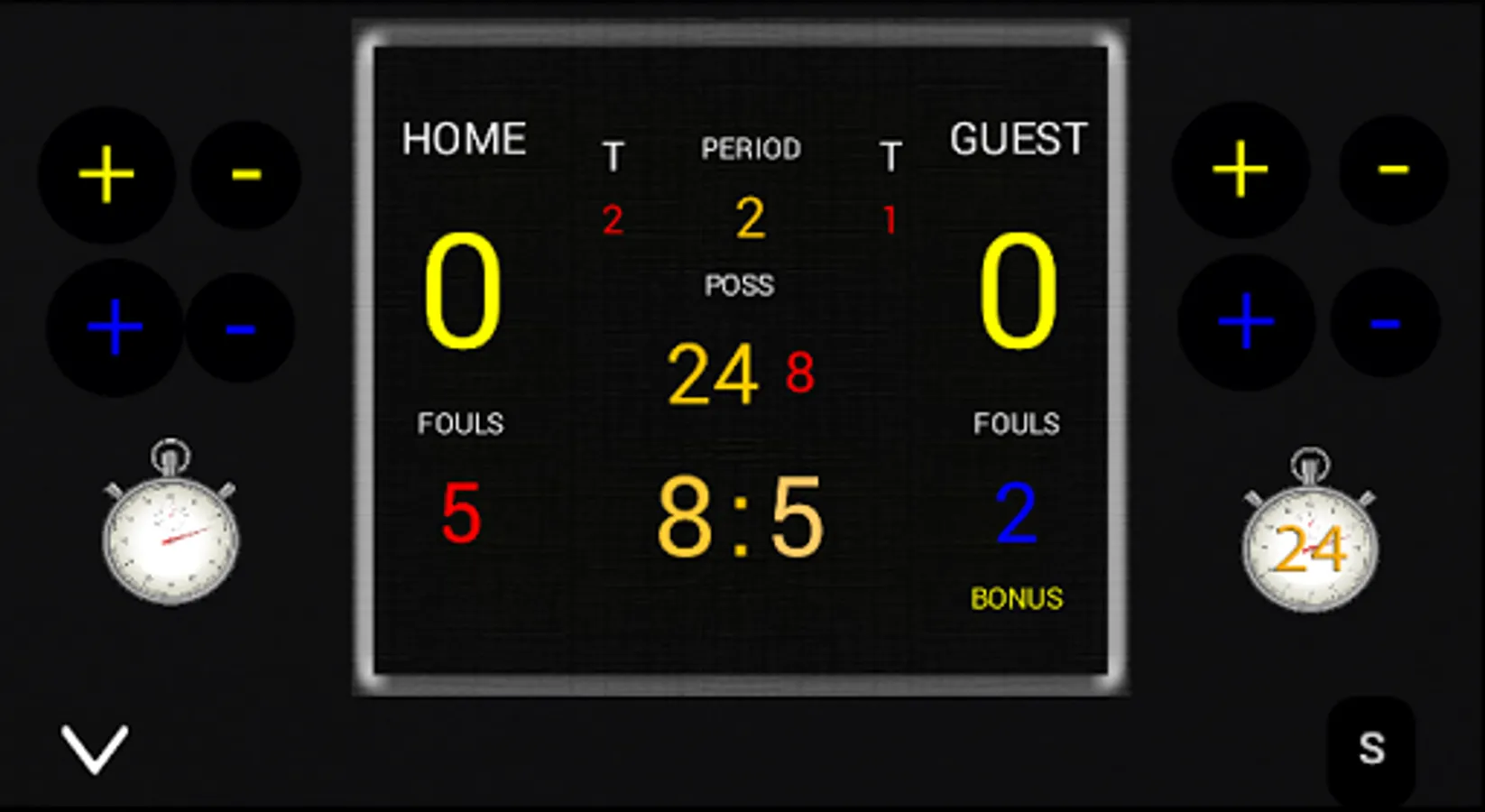 - Ball possession time 24 sec, with 8 seconds resettable output warning sound and vibration with manual and automatic reset time by adding points layup.