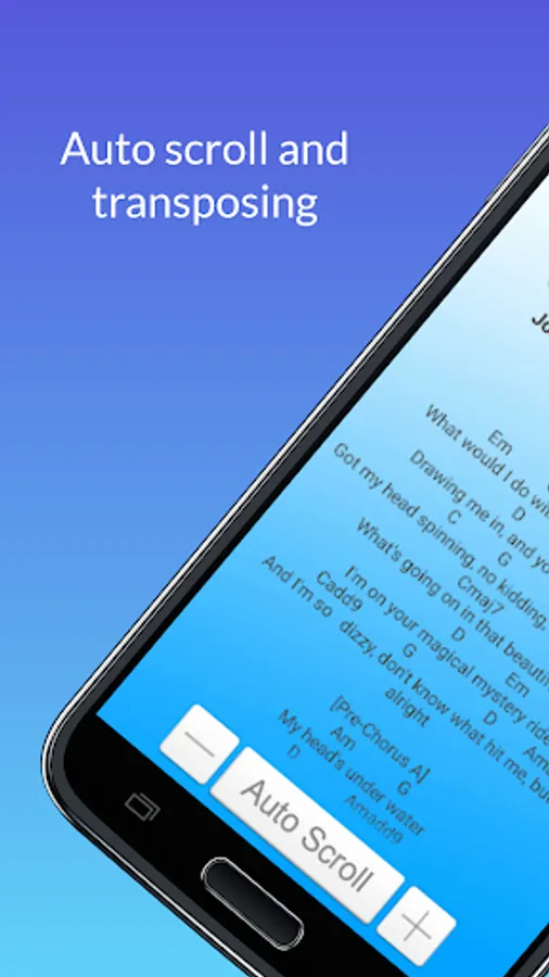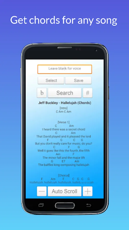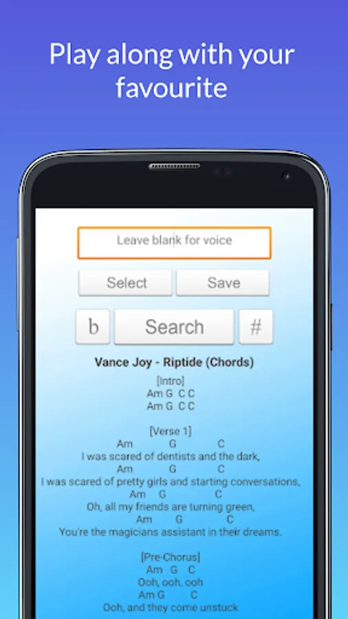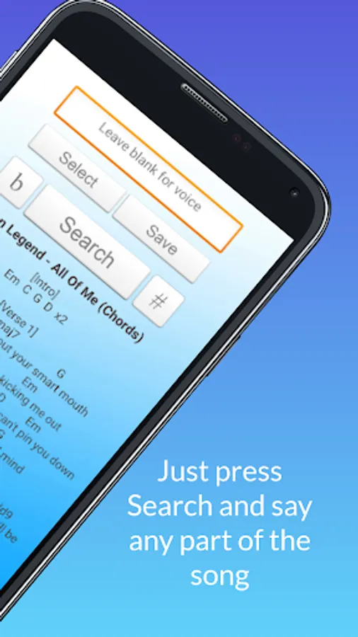 Just say the songname or any lyrics in the song and you got the chords right there. Keep your favorite songs in a playlist!