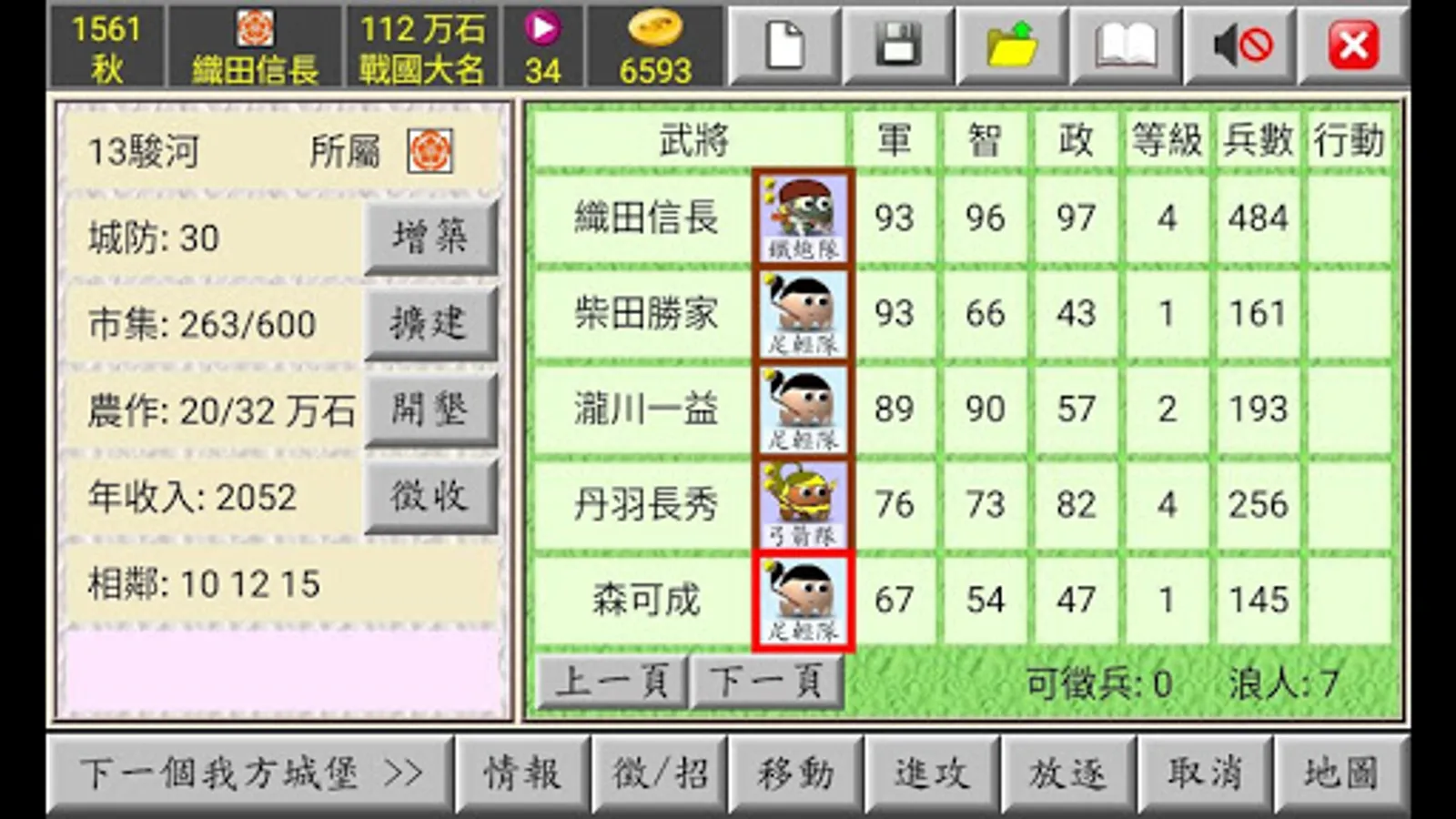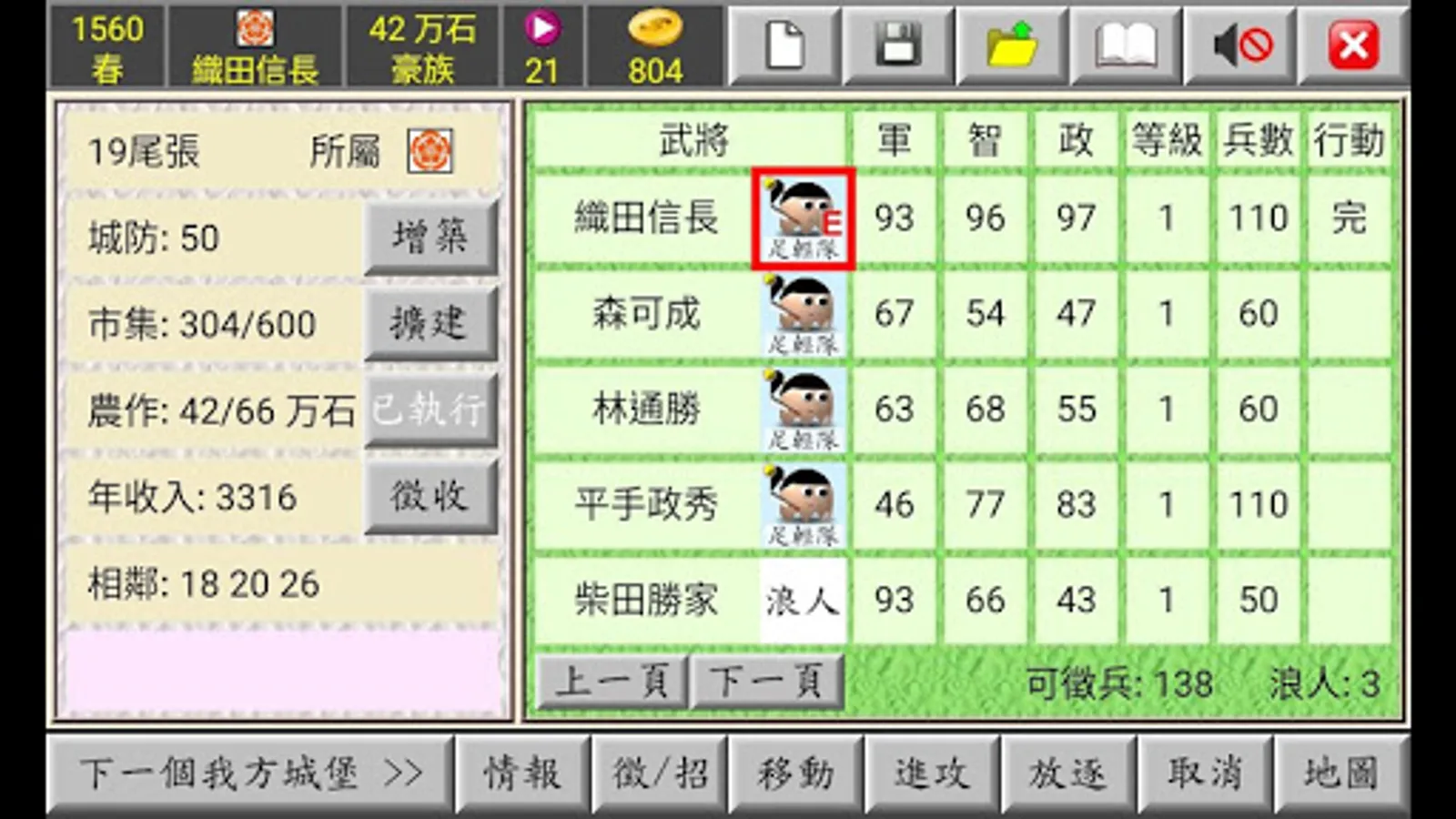 Recruit: Executing this command can also recruit ronin, even if the recruitment fails, the relationship with the ronin will be shortened.