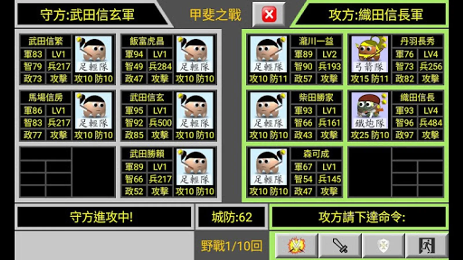 Defense: Troops can execute (attack) or (defense) commands to switch combat status.