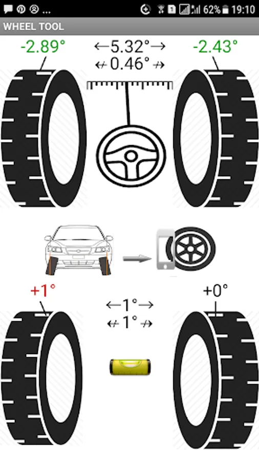Attention!!! This application is not intended for professional use and when is detected incorrect installation of the camber angle, it is recommended to contact the service center of maintenance of your car.