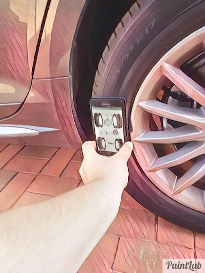 In the vertical position, attach back cover of the device to the clean, flat surface of the car's tire, press the corresponding wheel on the screen and wait until its pulsing ends.