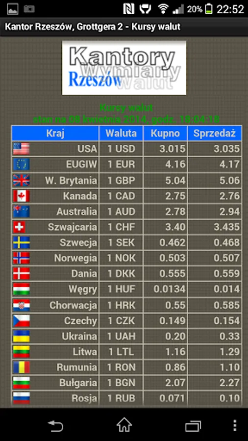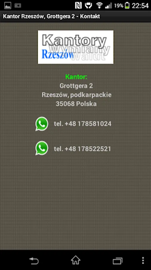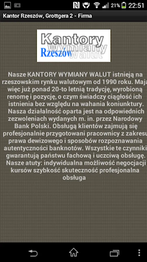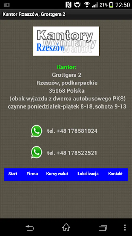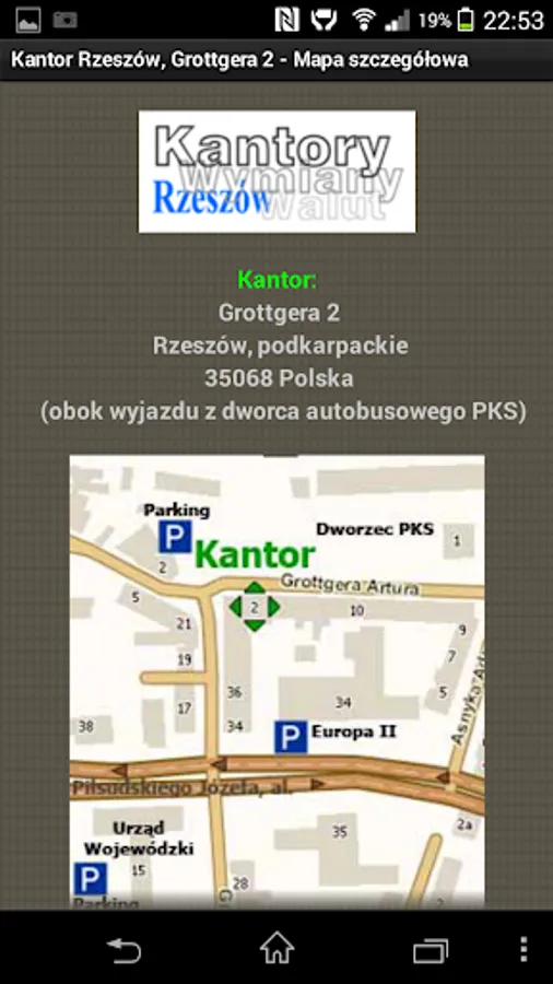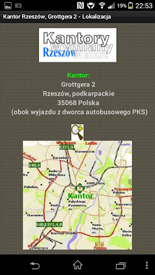 The application of the KWADRAT Currency Exchange Office in Rzeszów at Grottgera Street 2. Company information, contact details, company location and online exchange rates.
