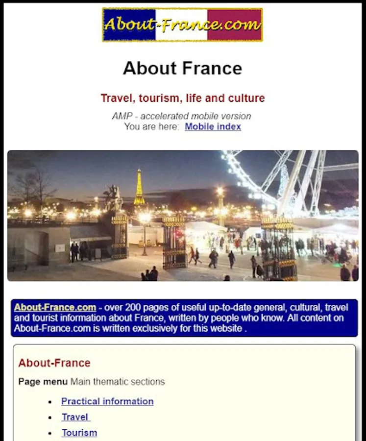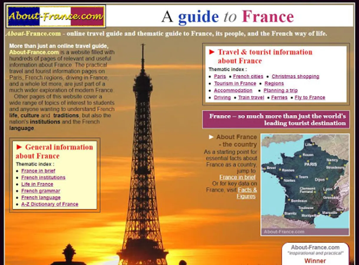 A full guide to France, covering travel and tourism, French life and culture. On the one hand this site covers essential information on Paris and the French regions, travel in France, French life and customs, the main sites and sights throughout France. On the other hand it also includes vital information about France as a country, French life, politics and institutions, French art, as well as a French grammar for students.