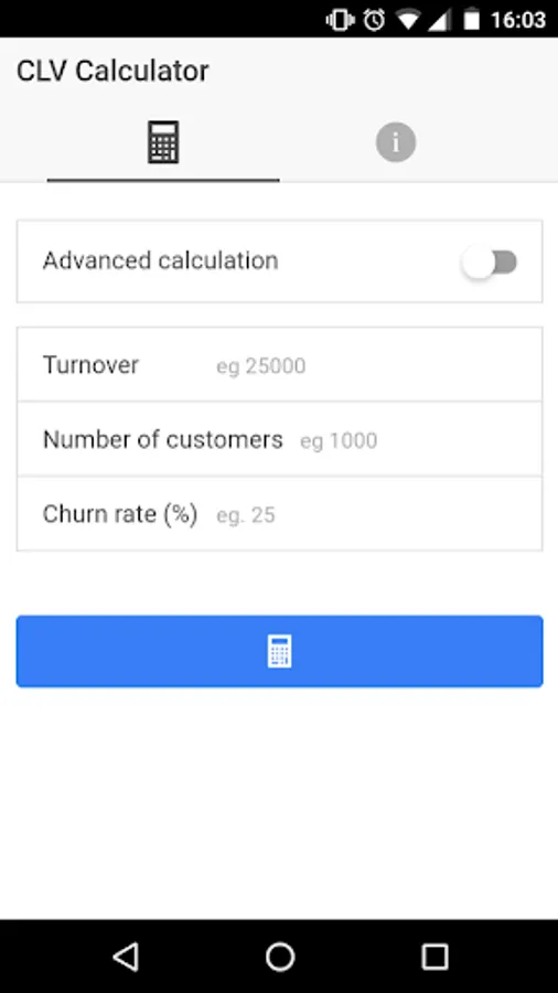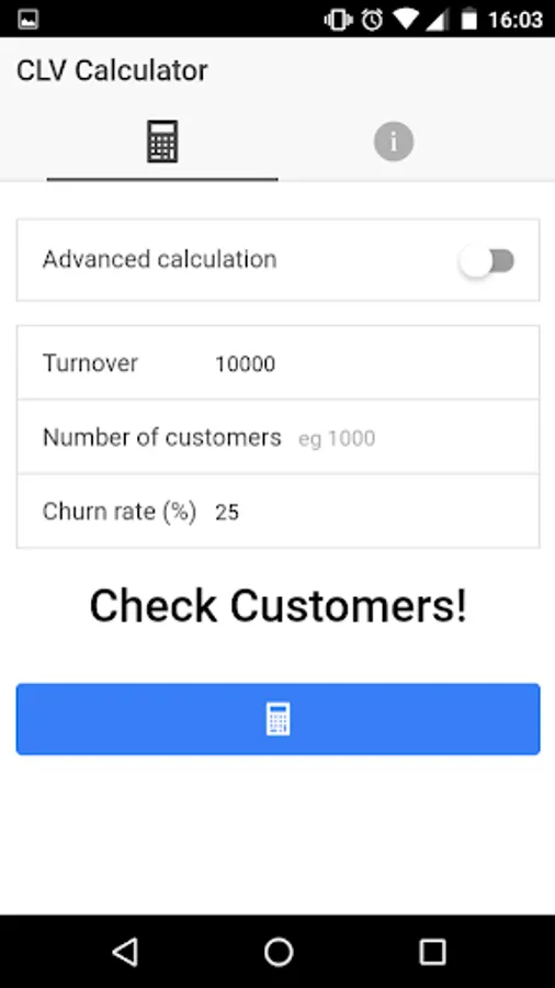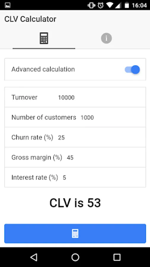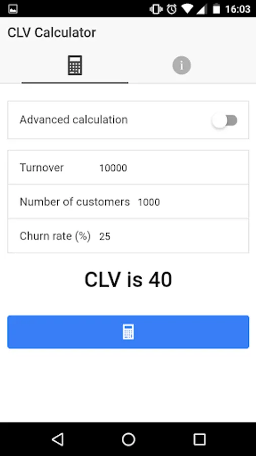 This calculator will allow you to estimate the CLV the simpler way; when the sales cycle is not too complicated you can approximate the calculation by using the 'turnover', 'number of customers', and 'churn rate' (% of customers that stop buying from you every month). When you need a more accurate value, you can do so by inputing the profit margin, and the interest rate.