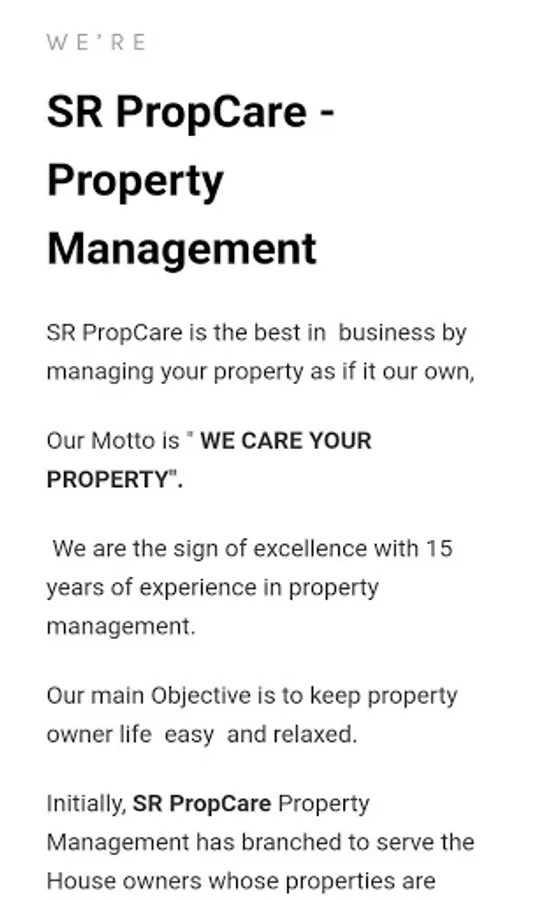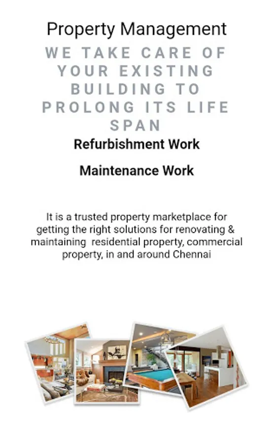 SR Propcare app for all your property Management services like Construction, CMDA Approval, Home Renovation, Water Proofing, Plumbing, Electrical, Carpentry, Tile Laying, False Ceiling, Fabrication Work, Painting, Pest Control, Interior Work.