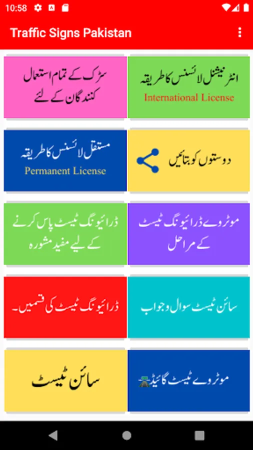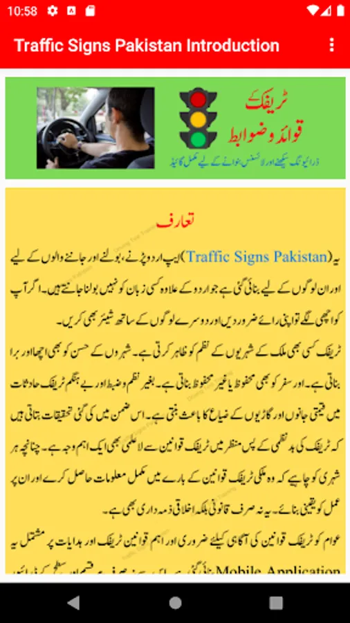 This mobile app is for all cities of Pakistan like Lahore, Karachi, Peshawar, Islamabad, Rawalpindi, and Quetta. All traffic rules in Urdu for Punjab, Sind, KPK, Kashmir, and Balochistan are also included.