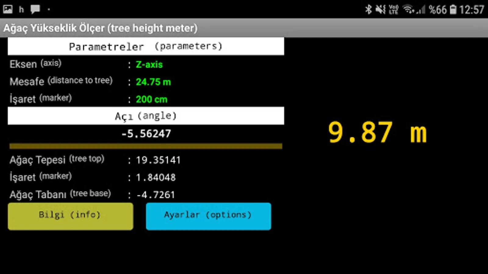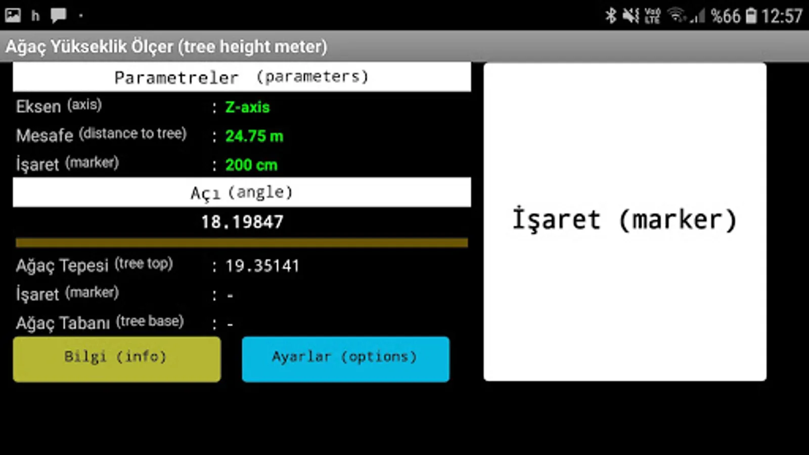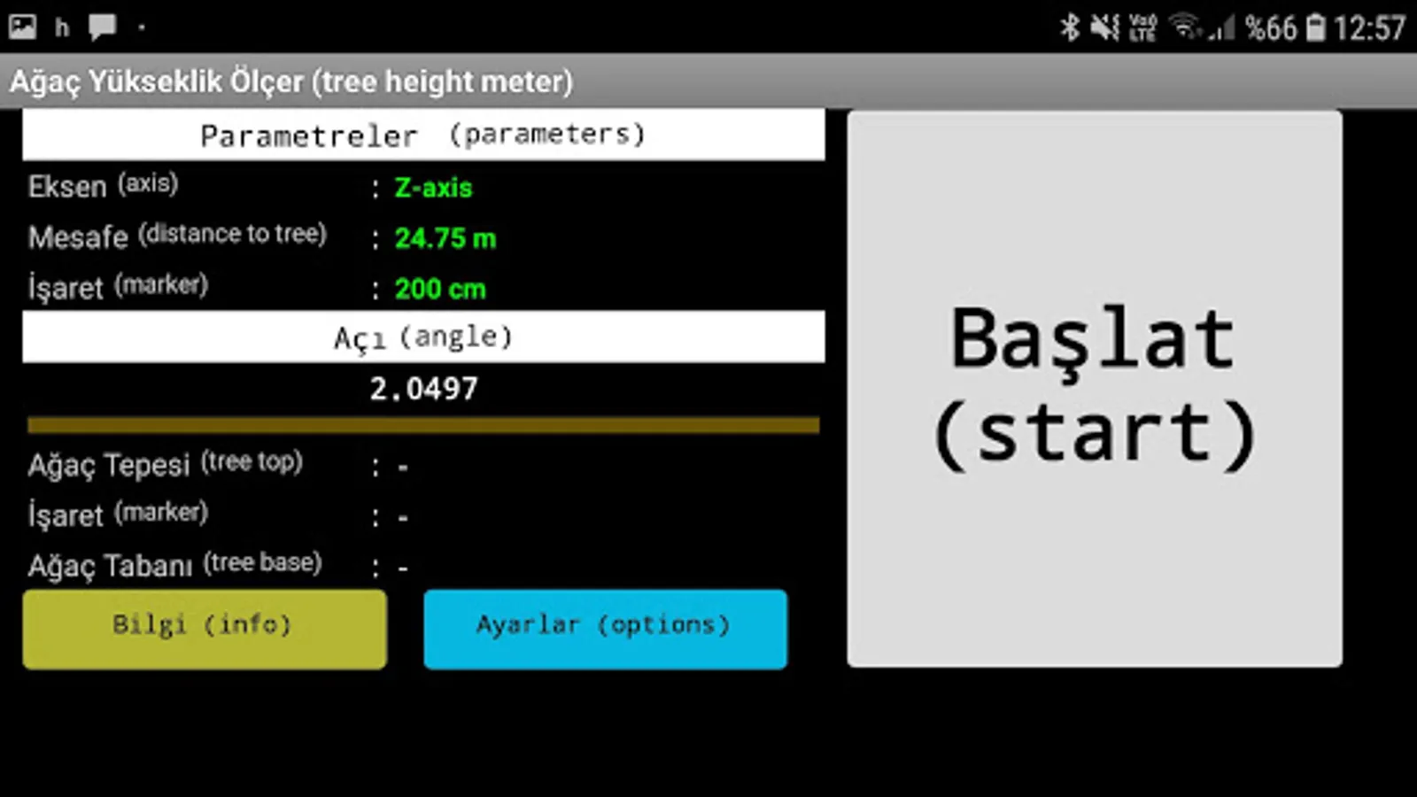 After starting the application, you must check the parameters before starting the measurement. From the Settings page, select an axis to suit your grip. Where you can see the tree and mark the height and distance.