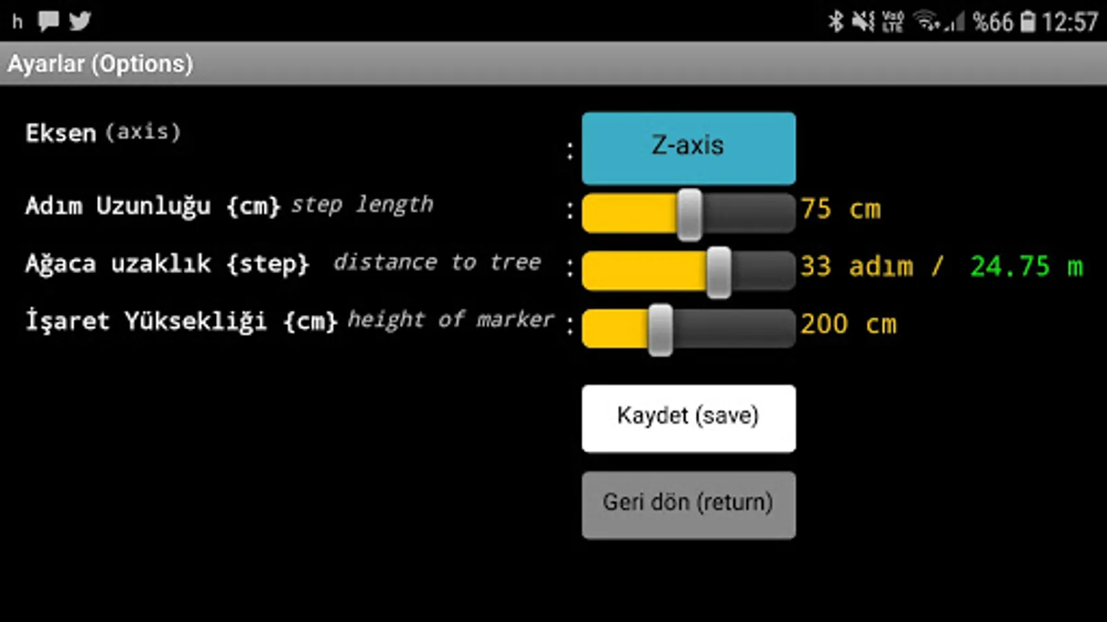 After starting the application, you must check the parameters before starting the measurement. From the Settings page, select an axis that fits your grip. Go to a place where you can see the tree and mark the height and distance to the tree by specifying the number of steps and step width to record.