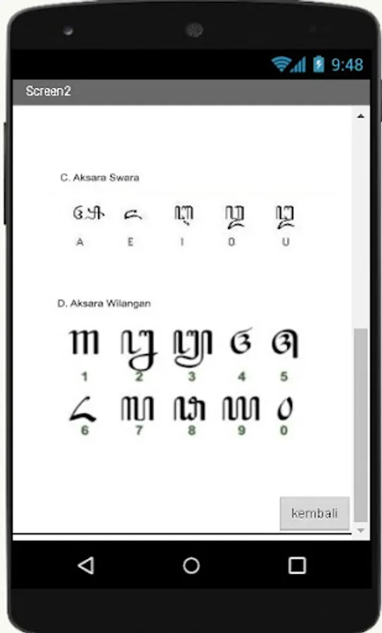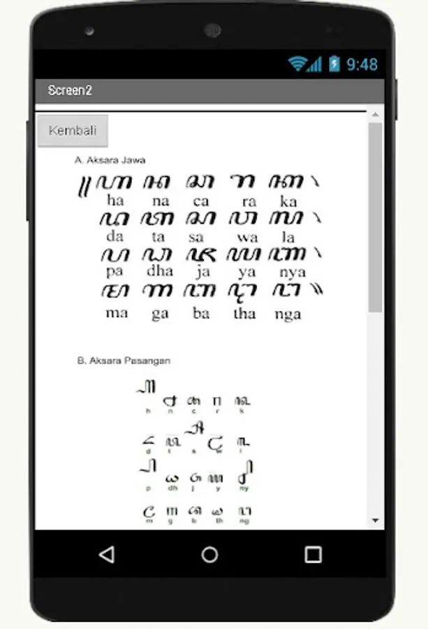 This application contains the letters of the Javanese script, couple script, swara script, and wilangan script