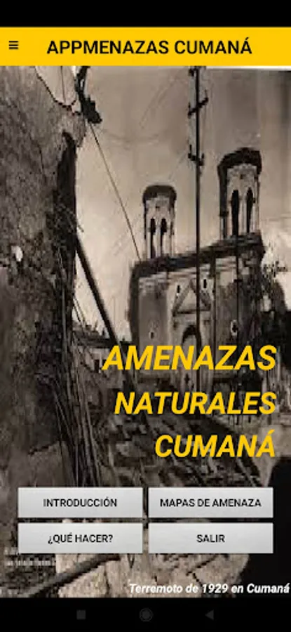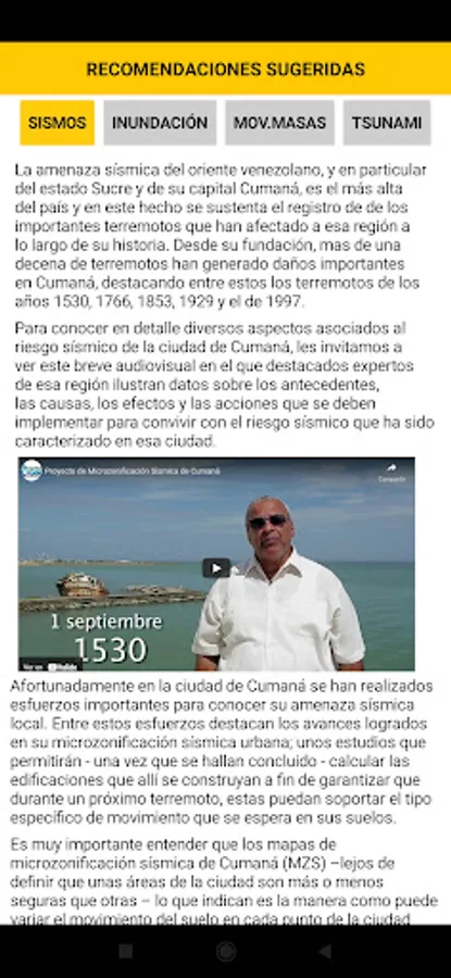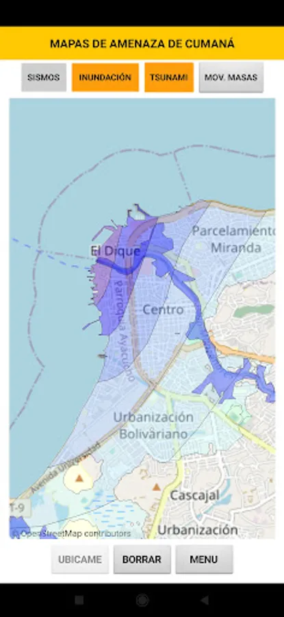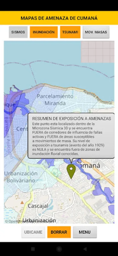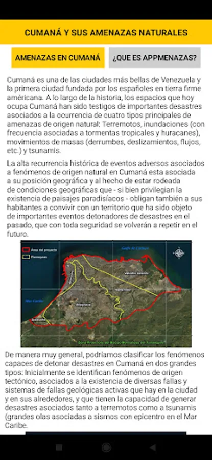 This application provides its user with georeferenced information on their exposure to four types of threats of natural origin identified in the city of Cumaná (Venezuela) as well as recommendations to reduce each of their respective risks.