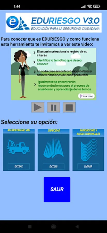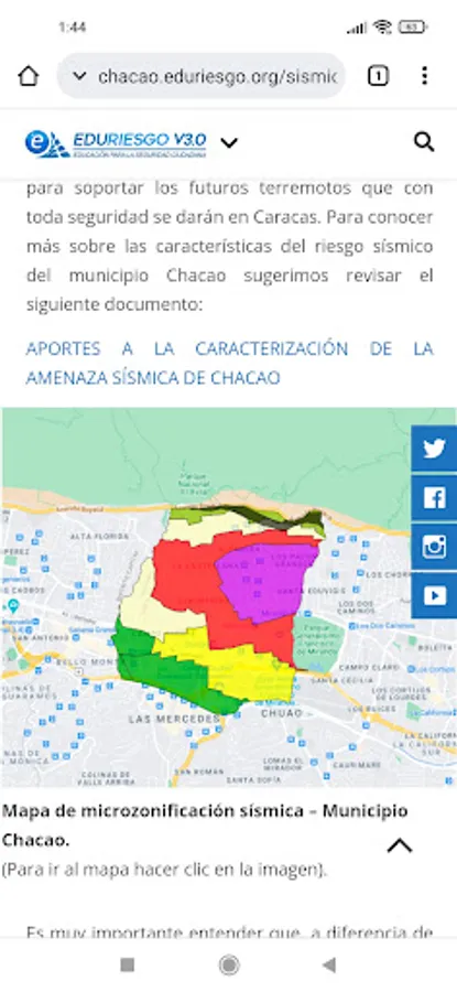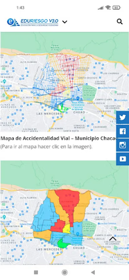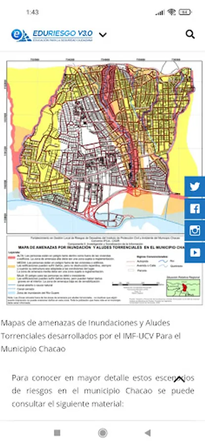 This is a version for smartphones of the data that the EDURIESGO website maintains on challenges to citizen security in the municipality of Chacao (Venezuela). In this application, users will be able to learn about the local risks associated with road accidents, seismicity and torrential avalanches that have been identified for this municipality in the capital, as well as recommendations for self-protection and tools for teaching about each of these urban risks.