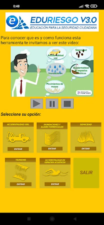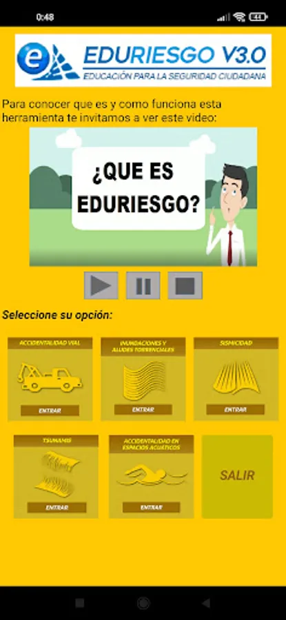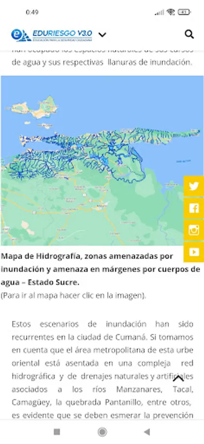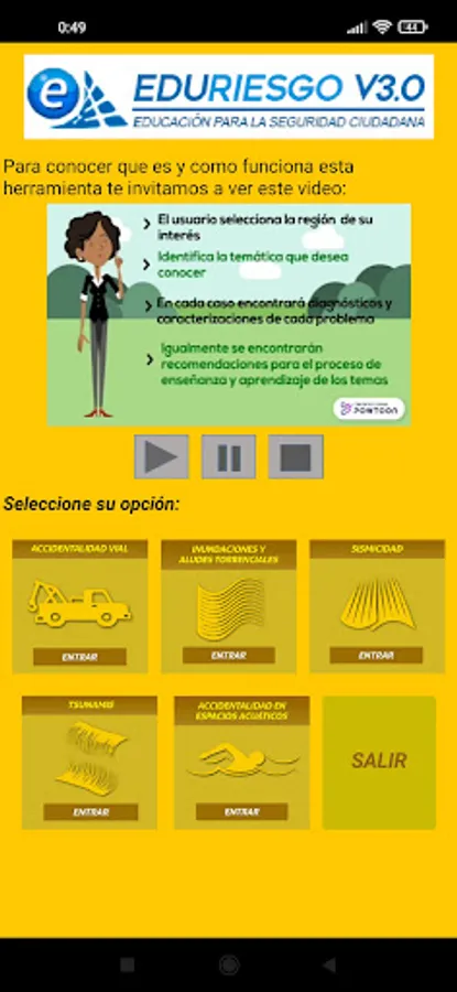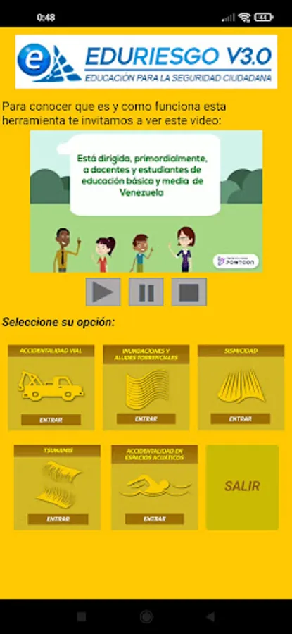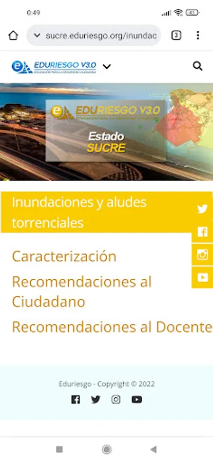 This is a version for smartphones of the data that the EDURIESGO website maintains on challenges to citizen security in the state of Sucre (Venezuela). In this application, users will be able to learn about the local risks associated with road accidents, water accidents, seismicity, floods and tsunamis that have been identified in the state of Sucre, as well as recommendations for self-protection and tools for teaching about each of these risks. .