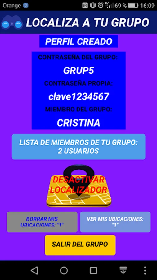 2- Once you have filled all fields of text, press the Create button and will store your passwords and your name in your profile. You to the screen of your profile with which you can manage your preferences and have access to the locations of group users that want to share.
