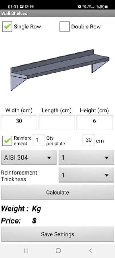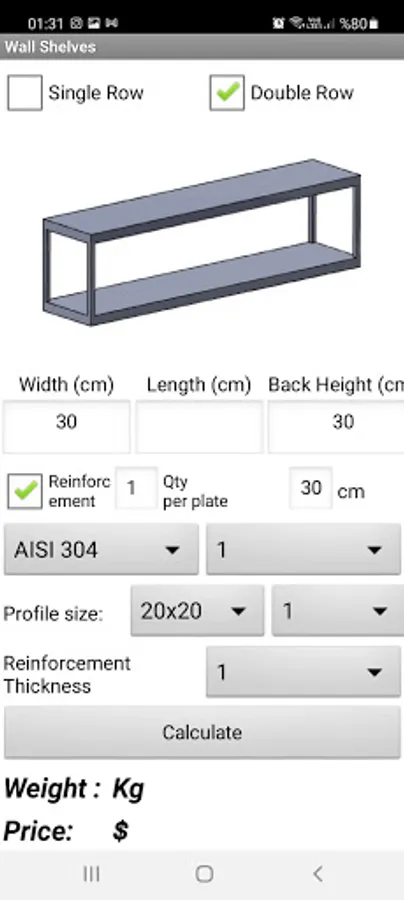Calculates the weights and costs of custom-sized industrial kitchen equipment (worktops, sinks, marble & polyethylene worktops, stacking shelves, hoods, material cabinets, wall shelves)