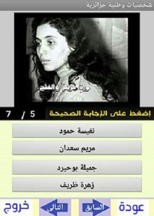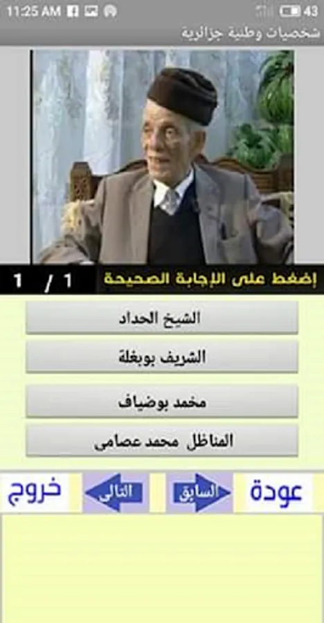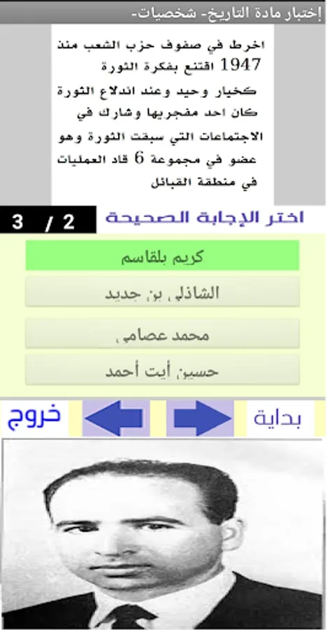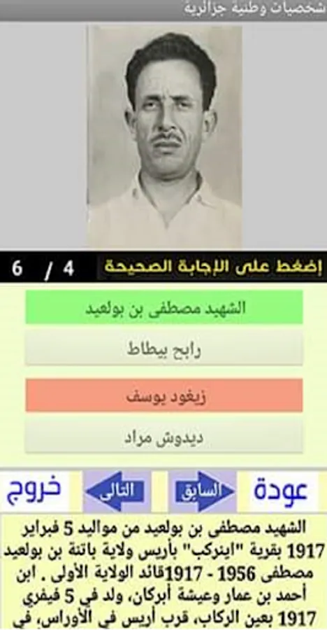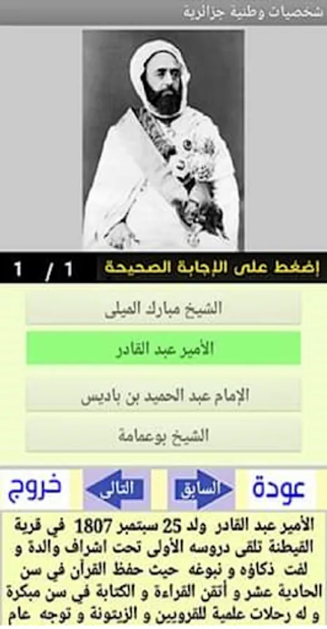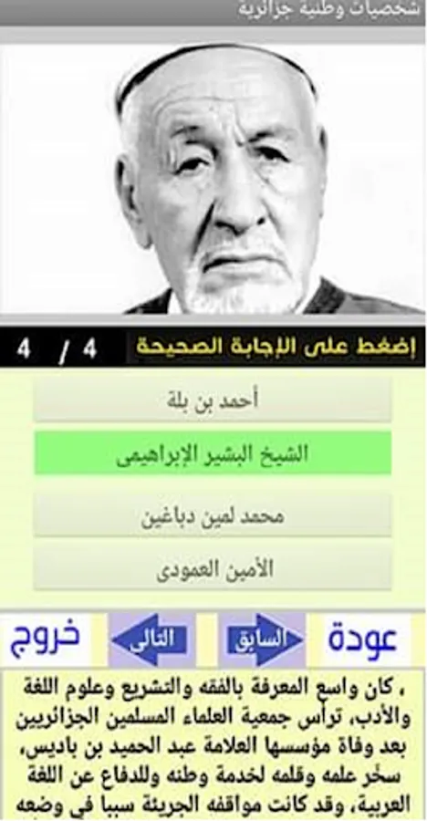 A test to know the extent to which the user knows the images of contemporary Algerian personalities, starting from the beginning of the history of the contemporary state of Algeria, and displaying images of the symbols of popular resistance, men of knowledge, politicians, heroes and martyrs of the Algerian liberation revolution. The Algerian in particular, and the students in particular, and the most important personalities whose history has been presented are the personality of Emir Abdelkader, Imam Abdelhamid bin Badis, Mohamed Essami Al-Manazl, Ben Boulaid, Jamila Bouhired, Larbi Ben Mhidi, etc.