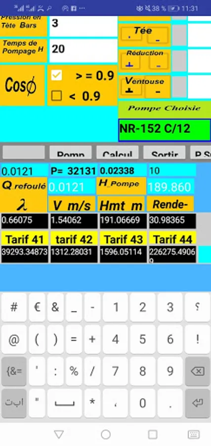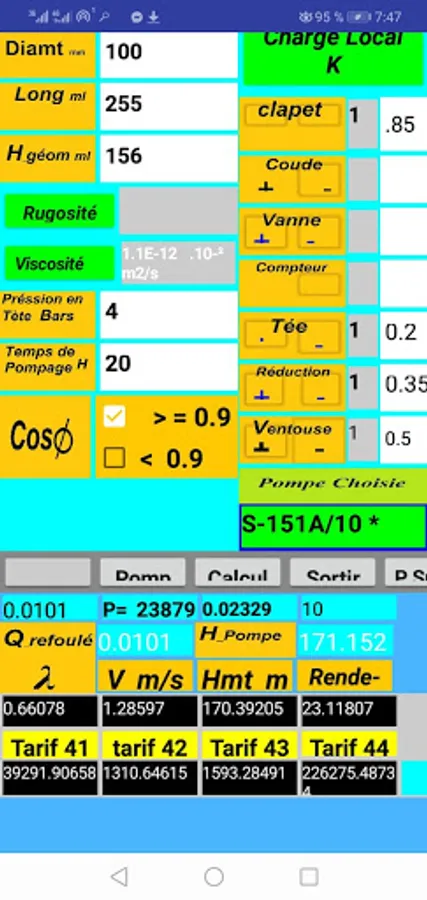 Application which makes a choice of submersible pump of the SAER brand and the best electric tariff of sonalgaz Algeria tariff 41 42 43 44 the user enters the parameters of the hydraulic networks flow pipe diameter roughness viscosity the geometric height the pipe length the hours of pumping local pressure drop coefficients of special parts. the application which contains a database of pump graph flow height: efficiency; power, automatically searches and finds the operating point of the best pump and the best electric tariff of sonalgaz Algeria tariff 41 42 43 44 the user enters the parameters of the hydraulic network flow pipe diameter roughness viscosity geometric height pipe length pumping hours local pressure drop coefficients of special parts. the application which contains a database of pump graph flow height: yield; power, automatically searches and finds the operating point of the best pump