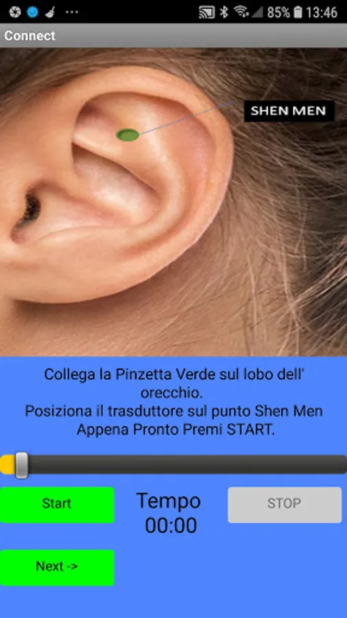 It stimulates certain points of the ear at certain frequencies through two small electrodes to be positioned in three specific points.