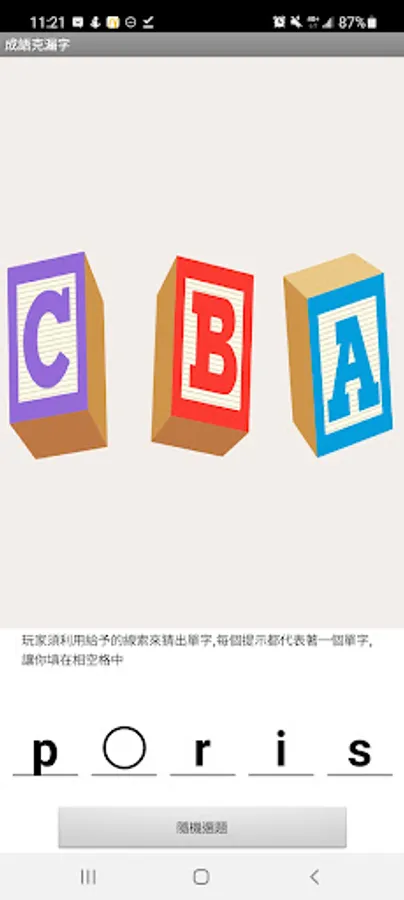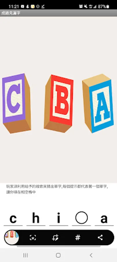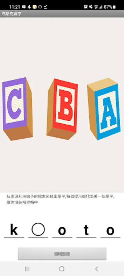 The rules of the game are: there will be five spaces in the question. Players need to judge which English letter is in the control according to the four letters provided as clues. After thinking about the answer, click on the space and the answer will appear. :D