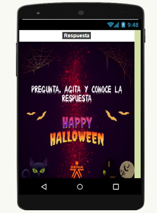 The application starts in order for the user to ask the device something, then shake the device to make it vibrate, display a random message on the screen, read the message and make a sound.