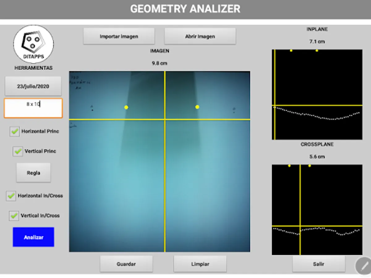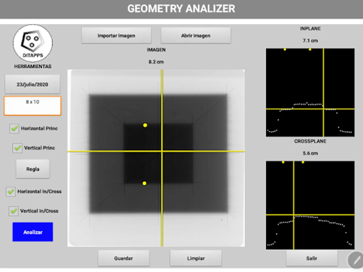 With BGA Radiotherapy (Beam Geometry Analyzer) you can analyze the flatness and symmetry of a radiation beam by generating the profiles from a biplanar image. You can get this information from a scanned x-ray or from a digital image obtained using a CR or DR.