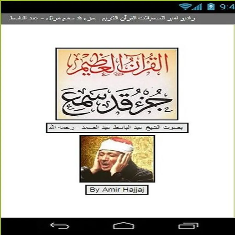 Part had heard (argument) the voice of Sheikh Abdul Basit Abdul Samad - Allah's mercy. Where you can hearer choose between continuous recitation started from any Sura in the list, or just click on a continuous recitation of a button to start the recitation of the first part etcetera then go back and continue reading. And you can hear the use of the temporary suspension of rice to stop.