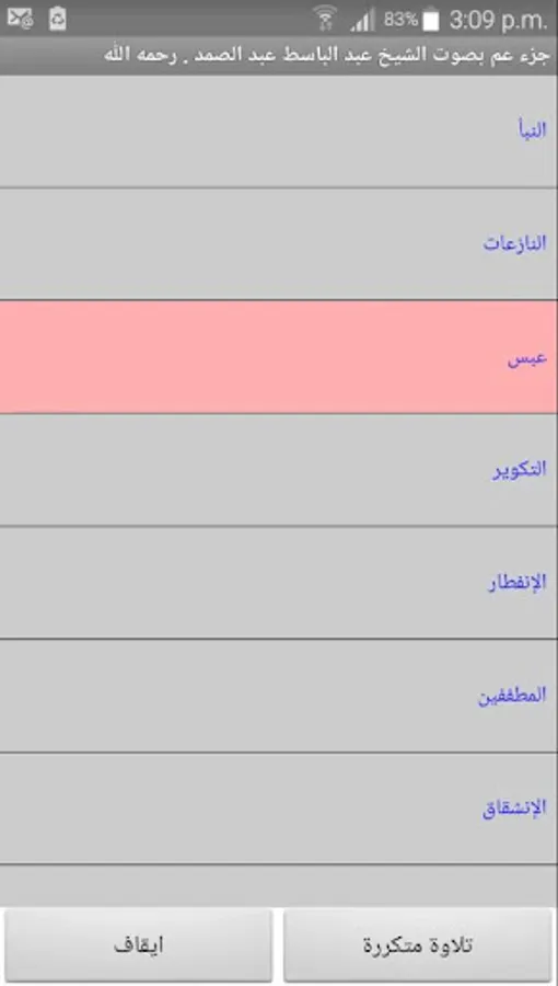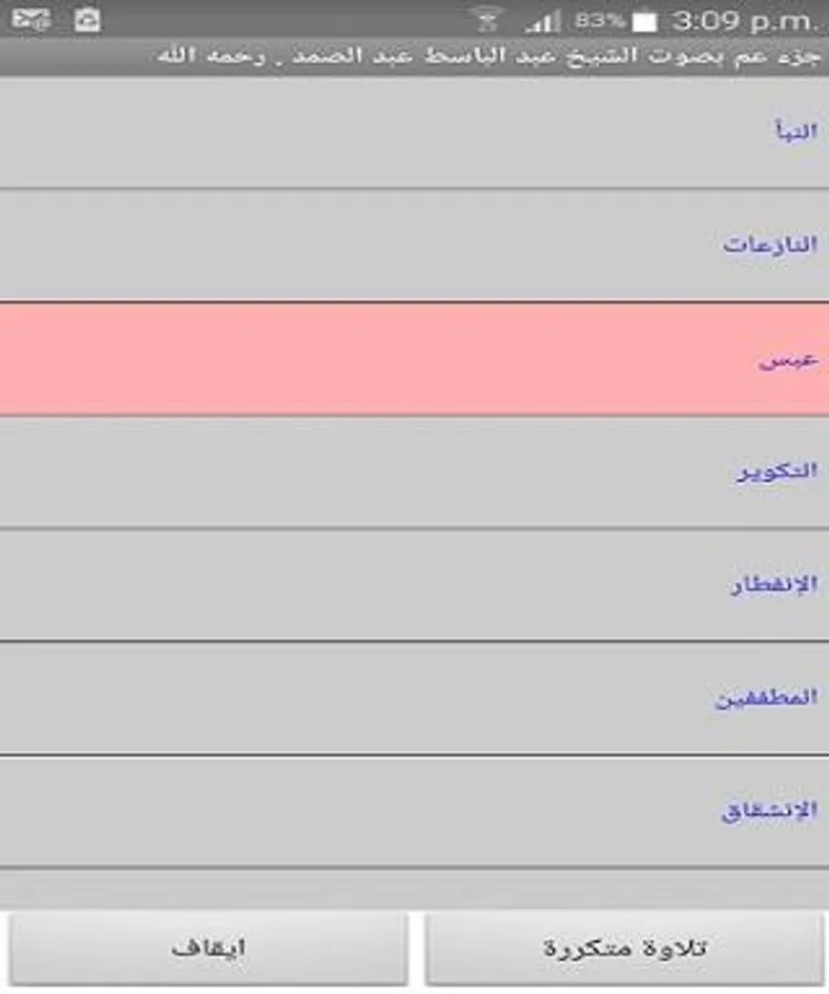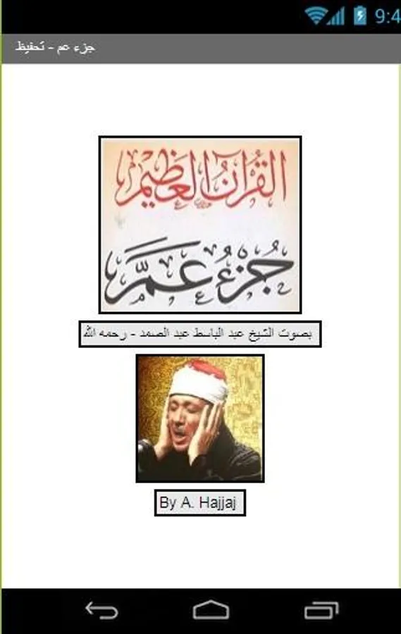 This application helps the memorization and review of conservation of Juz. Where it reads repeated the selected image from Amma - the voice of Sheikh Abdul Basit Abdul Samad - Allah's mercy