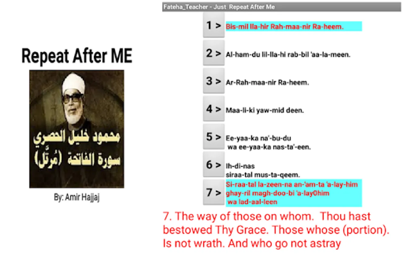 The apps is starting with the sound of sheikh Abdul Basit of the first Screen to say bismillah alrahman alrahim, then it moves to the second screen immediately to show the seven ayahs of the Fateha, the first chapter (Sourat Al Fateha) of the Holy quran.