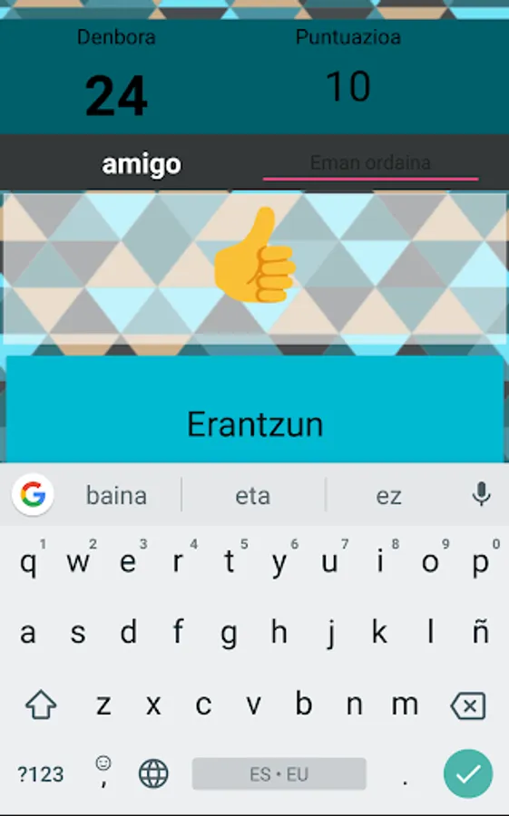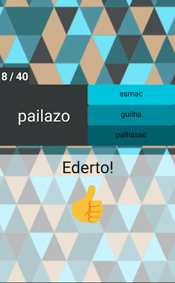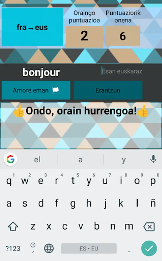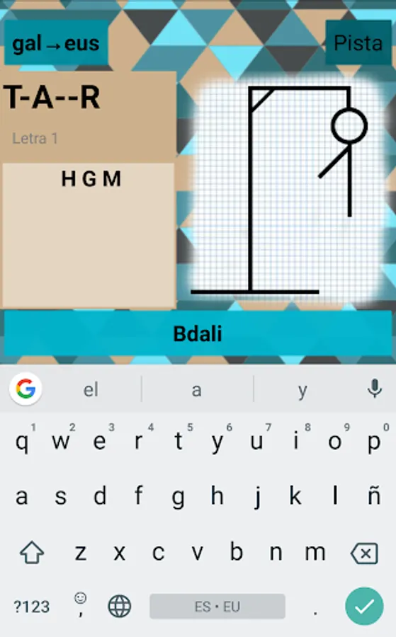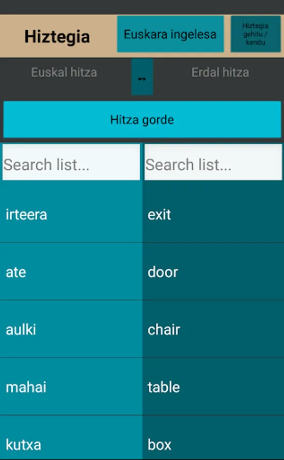 With this application you can learn words from the language you want through four games. To do this, you can enter the words you want to learn in the "My dictionaries" screen. In fact, it involves five dictionaries (Basque-Spanish, Basque-French, Basque-Gascony, Basque-English and Basque-Galician), but you can create or delete what you want. Remember, the more words you enter, the better.