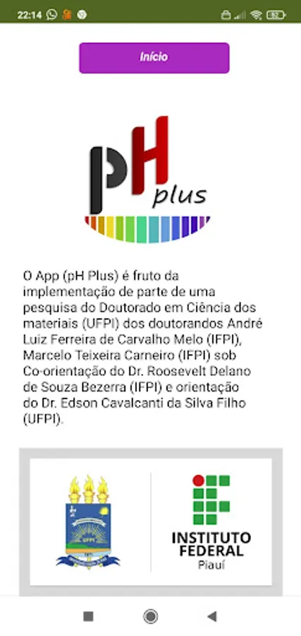 The App is intended to assist in setting the sample pH based on the Zero Charge Point (PCZ) test. pH Plus is the result of the implementation of part of a PhD research in Materials Science (UFPI) of doctoral students André Luiz Ferreira de Carvalho Melo (IFPI), Marcelo Teixeira Carneiro (IFPI) under Co-supervision of Dr. Roosevelt Delano de Souza Bezerra (IFPI) and supervision of Dr. Edson Cavalcanti da Silva Filho (UFPI).