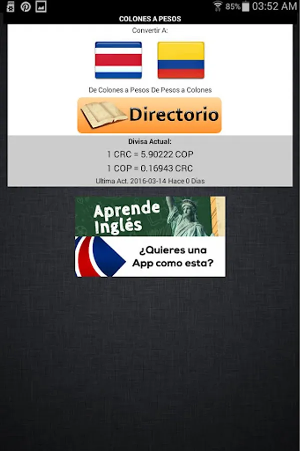 We bring you this app so you can convert Colombian Pesos (COP) to Costa Rican colones (CRC) and vice versa. You can have the change of currency FREE day!