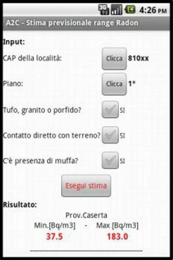 In the calculation page you can get an estimate of the predictive concentrations of radon in the form of minimum-maximum range (NB. This capability, for the moment, is usable only for the region).