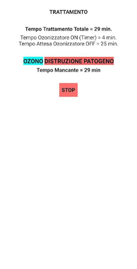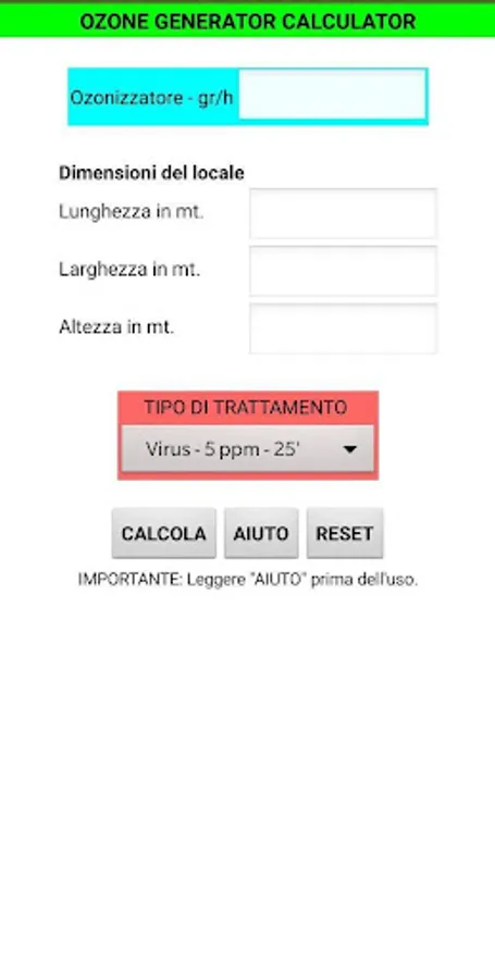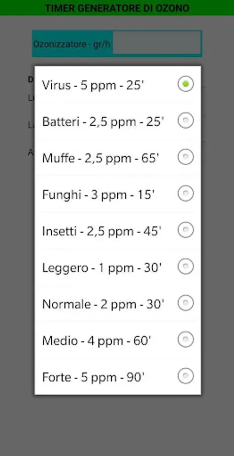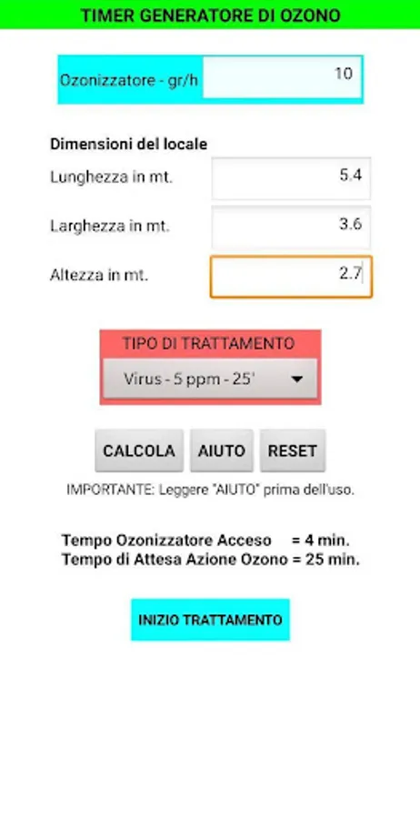 The App calculates the amount of ozone and the saturation and treatment times based on the generation power of the apparatus, the cubic capacity of the room and the pathogen to be treated.