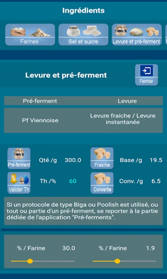 5 / Converters brings together several tools: The first allows, according to a given quantity of sucrose, to establish a mixture of various sugars in order to obtain an equivalent sweetening power. The second allows, when to him, to calculate the fermentation time of a dough, starting from a time and quantity of yeast established ... the modification of one of these 2 parameters will give you a good estimate of the new time. fermentation. The third allows you to calculate the equivalent amount of yeast according to its type.