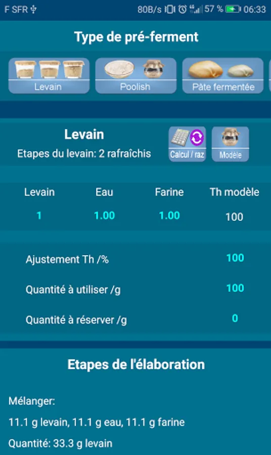 A yeast sourdough mode makes it possible to recalculate the recipe in order to carry out the latter on yeast sourdough or not.