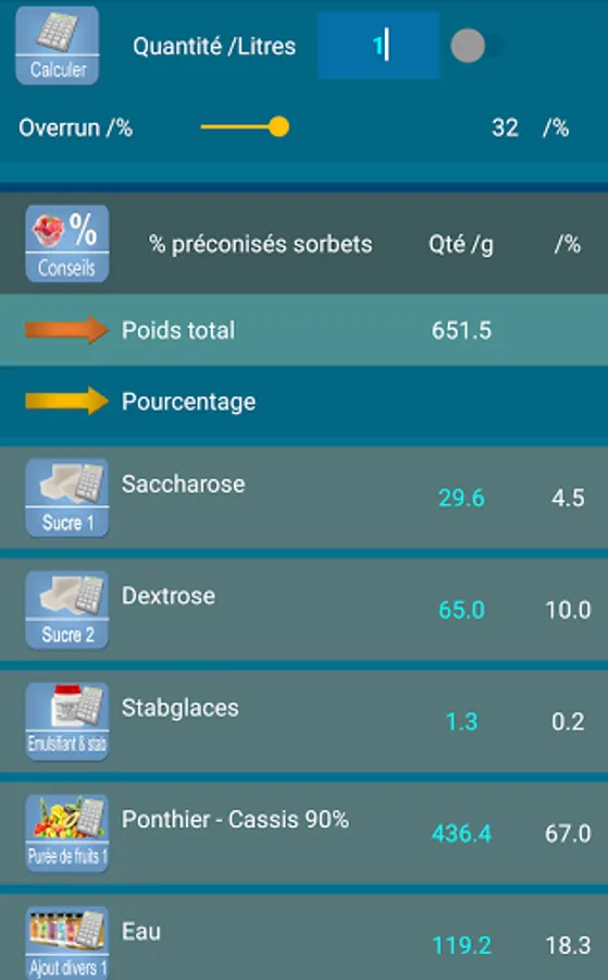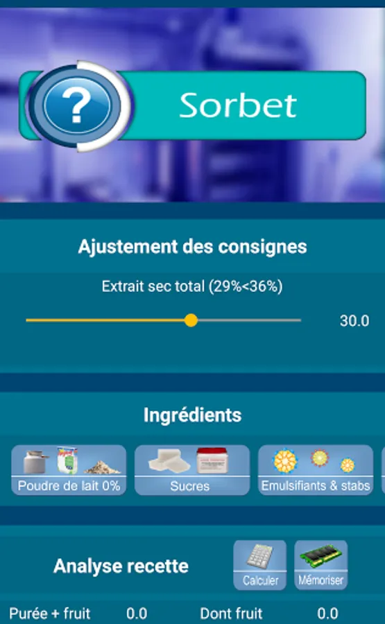 2 / Sorbet: The sorbet part uses the same process as the development of ice cream recipes, while using the balancing percentages that are specific to it. The functions are identical.