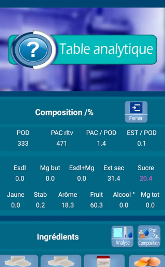 3 / Analytical table: Presents an analytical table in the form of an evolving and scrolling table. Possibility of loading the ingredients supplied with their characteristics, or of modifying them, or even creating them.