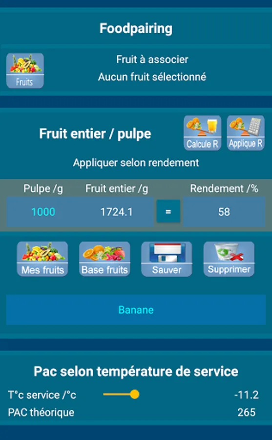 b / A tool which allows to calculate, determine and record the ratio of "whole fruit / pulp" fruits. This is in order to be able to determine the quantity of fruit to be expected according to the quantity of pulp required. Possibility to save your own fruits and percentages.