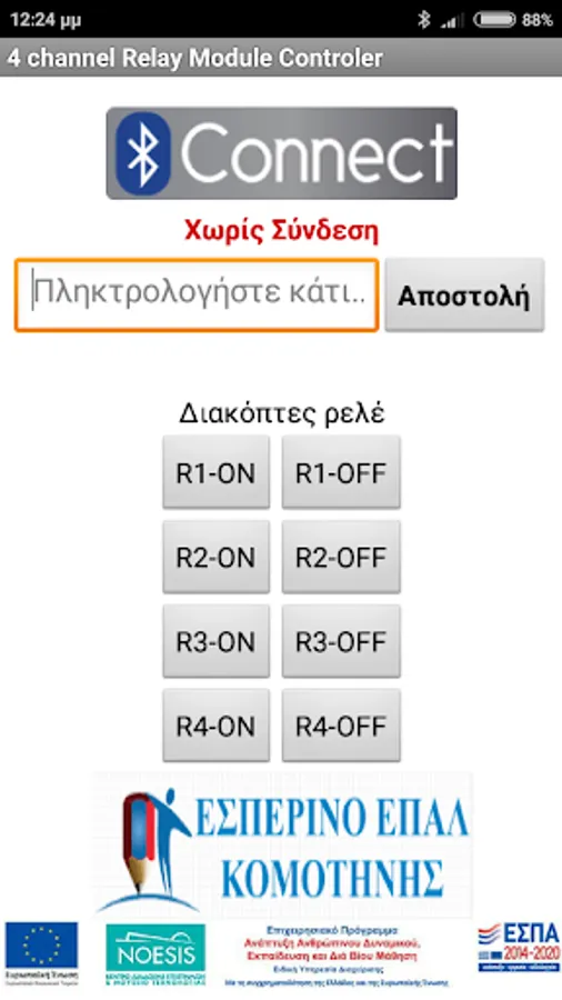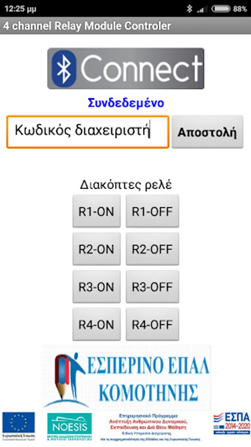 This application was developed with the help of the students of the Epitropi Epole Komotini, as part of the action MIS 5011051 "Support and Management of the Action Plans" A New Authority to the EPAL ". The application is connected via a bluetooth network with an arduino controller.