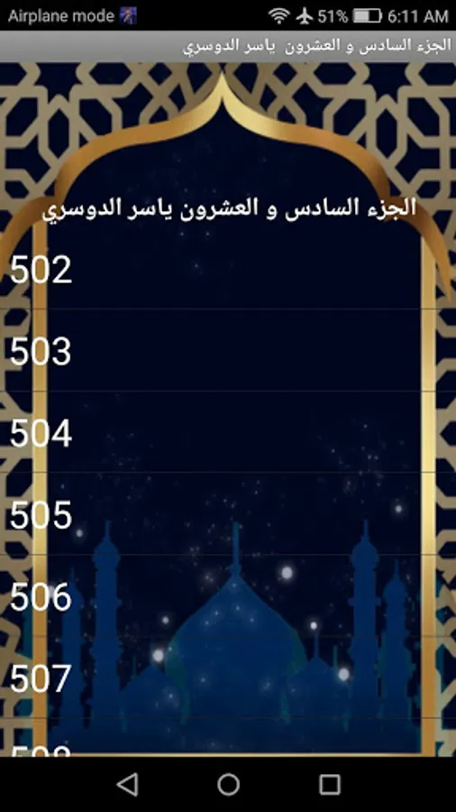 An application that helps memorize the twenty-sixth part of the Noble Qur’an recitation of Sheikh Yasser Al-Dosari. The application is characterized by controlling the repetition of the page or repeating the full recitation of the part with the ability to display the pages of the Qur’an with the recitation. Recitation can also be stopped at a specific location and then continue reading and hearing in case of desire to That application does not need internet. Download the application only once. We wish you to enjoy the application and enjoy the Sheikh’s recitation