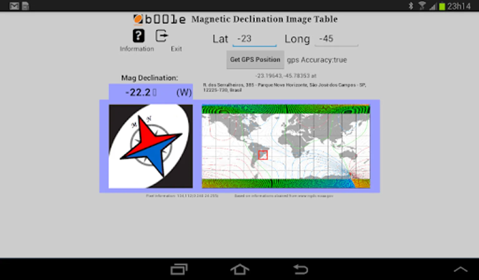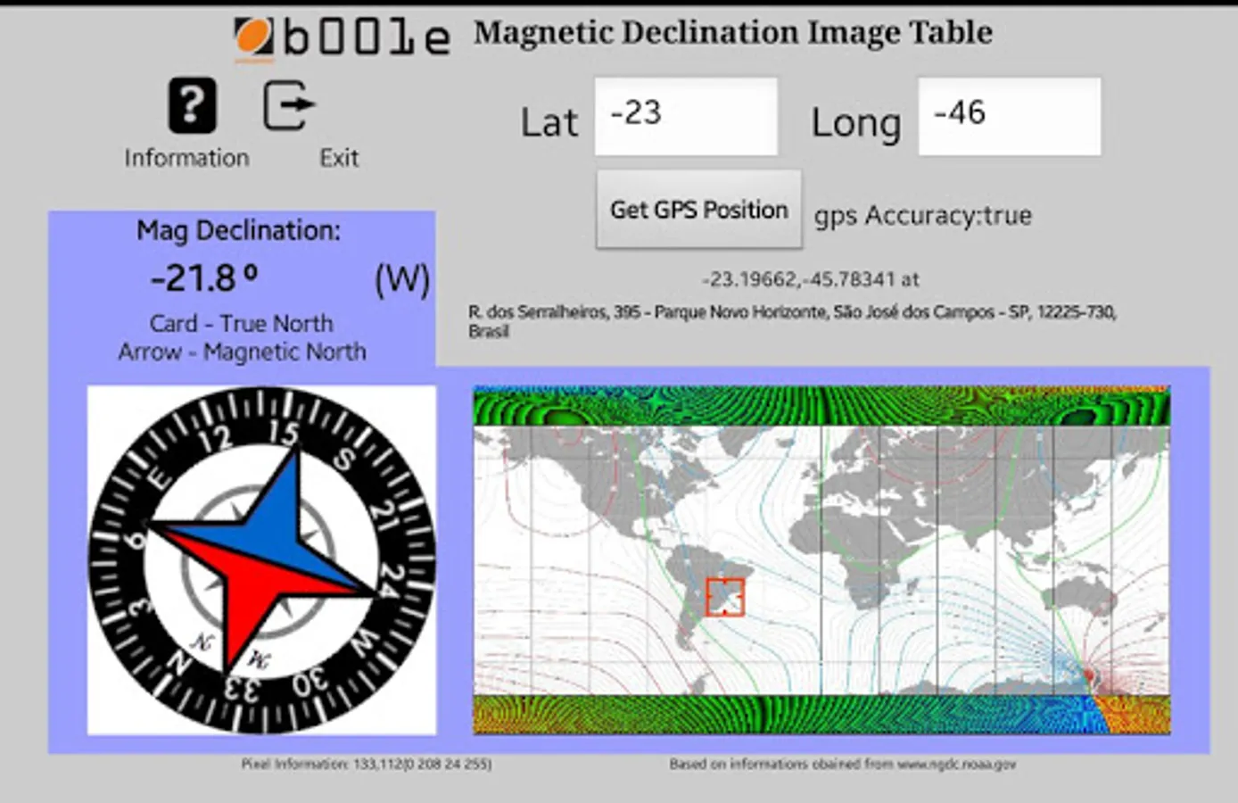 The world map with the declinations lines was obtained from https://www.ngdc.noaa.gov/geomag/magfield-wist/