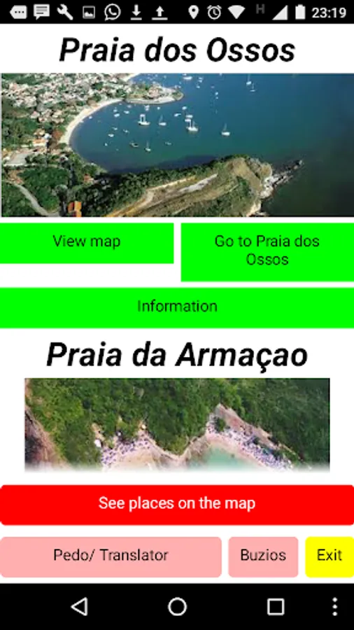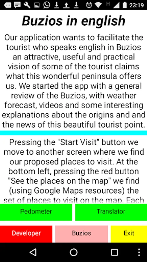 Finally, in this screen we have incorporated two buttons that correspond with tools that we consider to be useful. A pedometer that will measure the number of steps we take on our walks and calculate the distance covered at a rate of 0.73 m. by step and a translator Portuguese-English and English-Portuguese that can get us out of some quagmire. We would like our app to accompany your tour of Buzios.