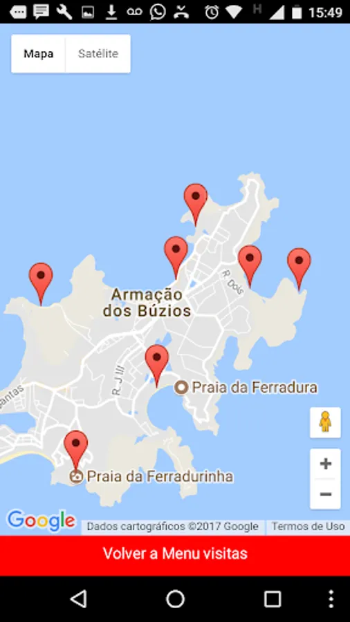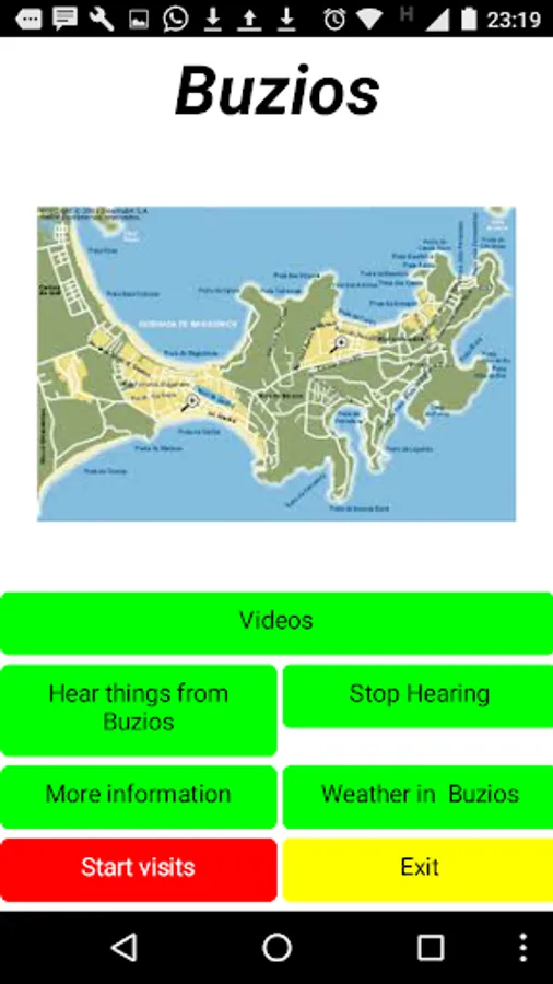 Pressing the "Start Visit" button we move to another screen where we find our proposed places to visit. At the bottom left, pressing the red button "See the places on the map" we find (using Google Maps resources) the set of places to visit on the map. Each of our suggestions is accompanied by three buttons, one of them provide information about the place (text-site buziosonline), and the other two position the point on the map by automatically tracing a route from where we are to the point in question , with information of travel time, alternatives, km, restaurants, shops, etc. etc.