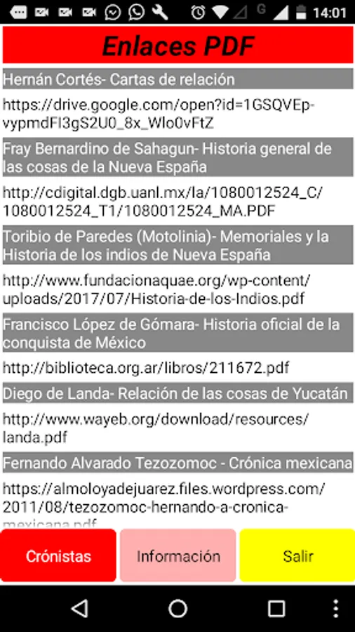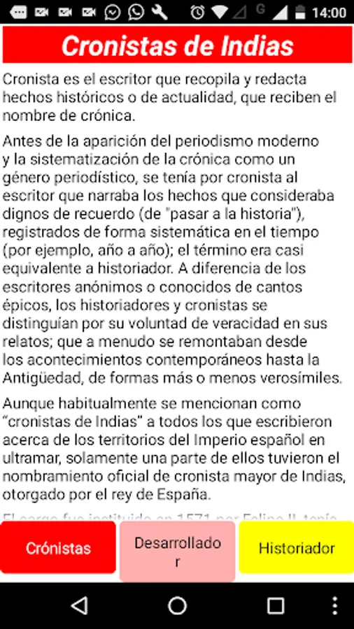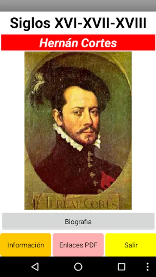 In the app relate the "Chroniclers of the Indies" which detailed information not only with the time of conquest but also the decades of the Viceroyalty of New Spain. We also try to give the vision of the conquered, not only of the conquistadors, with the biography of the author and highlighting its most representative versions with links to "free" (18 books) for easy reading work.