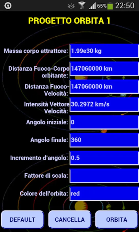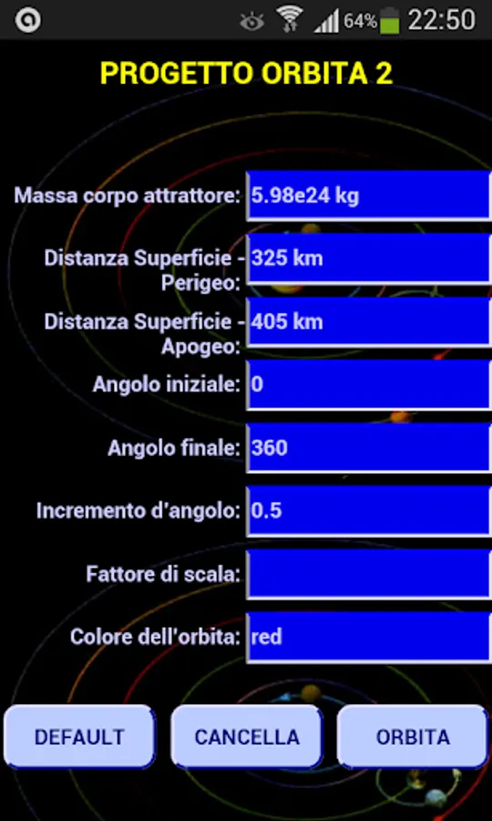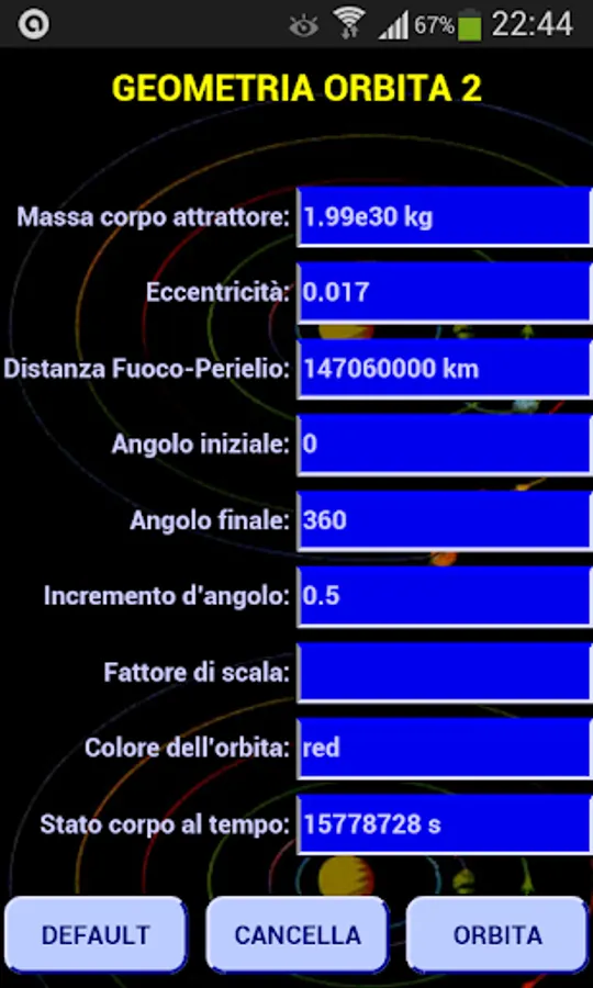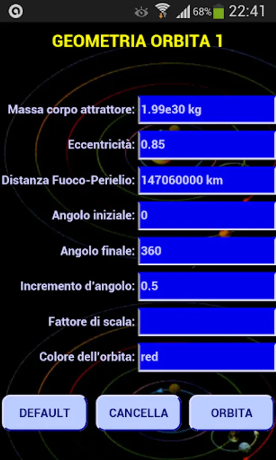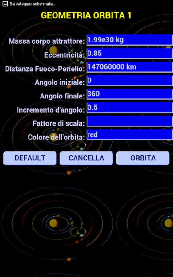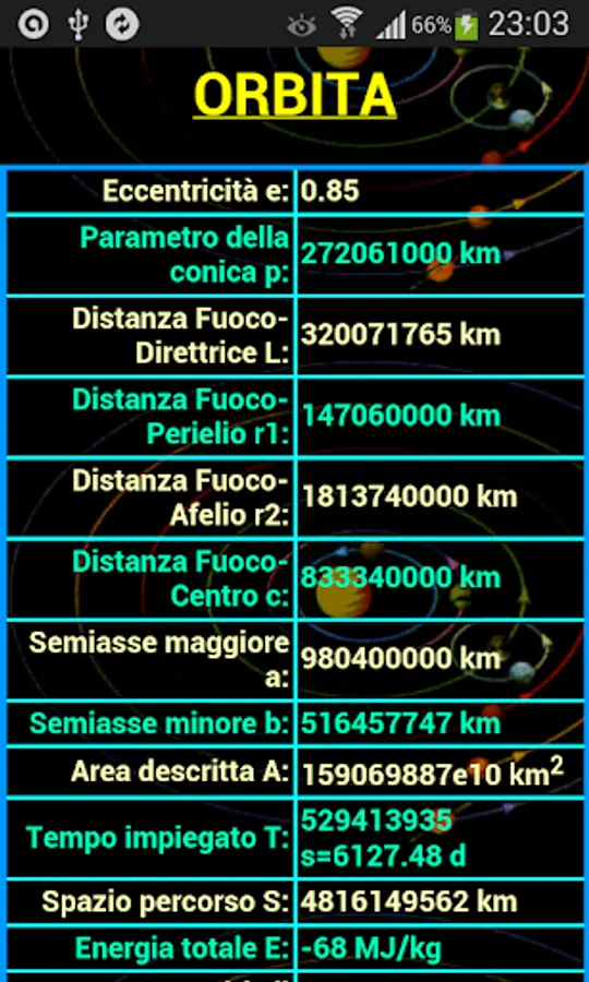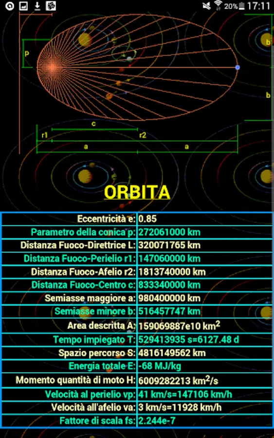 The other four buttons allow the orbit determination and graphically, ie the orbit is drawn, that table form that collects all the characteristics of the orbit.