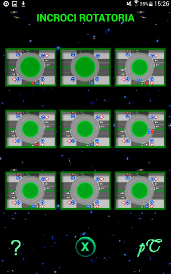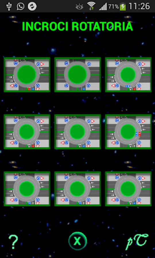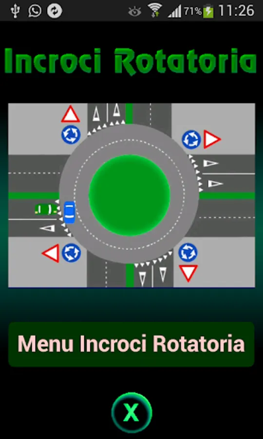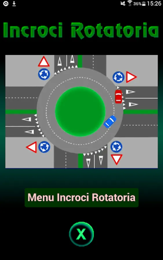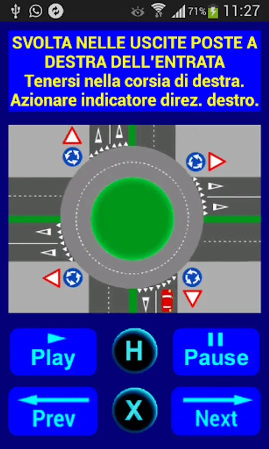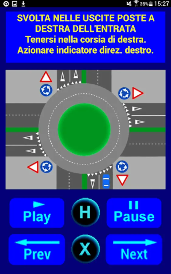 After launching the application and touching the "Roundabout Crossings Menu" button, the screen for choosing the intersection to be displayed and animated appears; in this screen also appears the link to the Guide where there is the?, in fact by touching? the Help screen appears, explaining in detail how to navigate roundabout intersections and how to use the application. In the intersection selection menu, after touching an intersection a new screen appears where you can animate the intersection by clicking on the Play button. For more information on the application, refer to the Help.