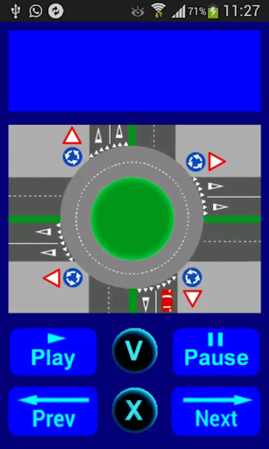 The application shows with vehicle animation how to tackle an intersection with roundabout traffic, respecting the rules of conduct of the Highway Code.