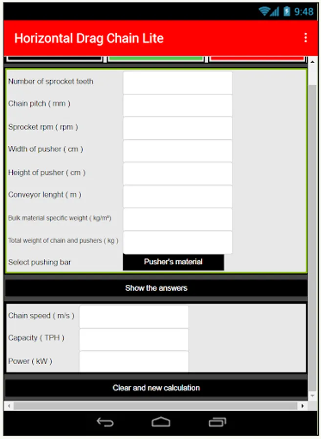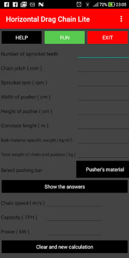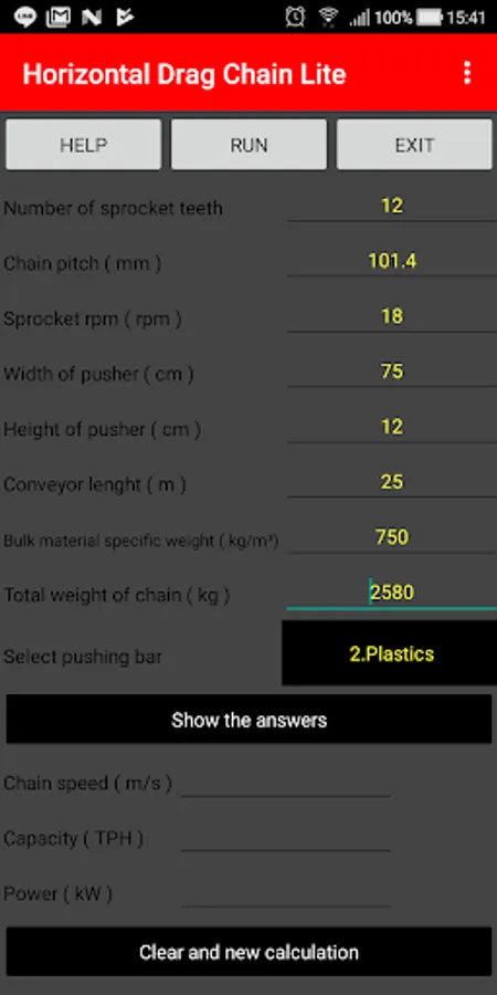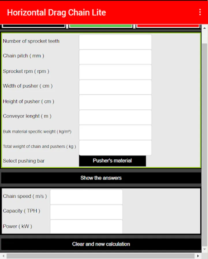 This application is suitable to calculate the chain speed, capacity of the drag chain conveyor and drive power requirement.