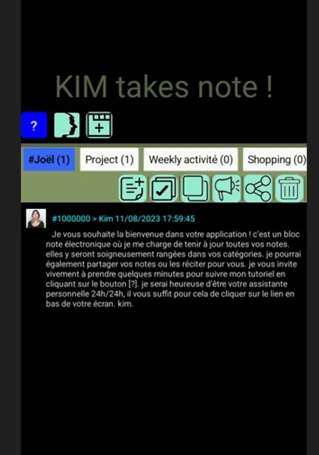 KIM takes note is your dedicated assistant for organizing notes in her notepad, forwarding them (via WhatsApp, notepad, or any other of your applications), and removing them.