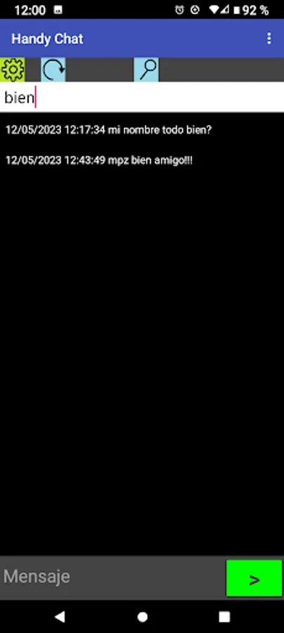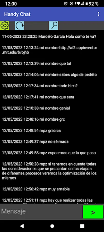 App where a group of users register to form a united text chat group with details of time, user and text written by each one.